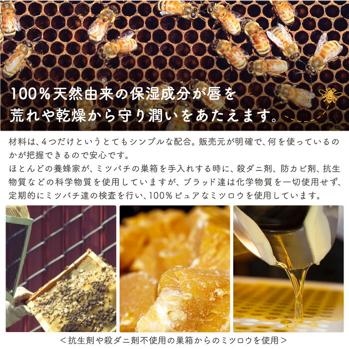 ビーバームは化学成分を一切使用していない100%ピュアなミツロウと、オーガニックエキストラバージンココナッツオイル、オーガニックエキストラバージンオリーブオイル、オレゴン産のオーガニックミント、これらたった4つの厳選された成分で作られています。