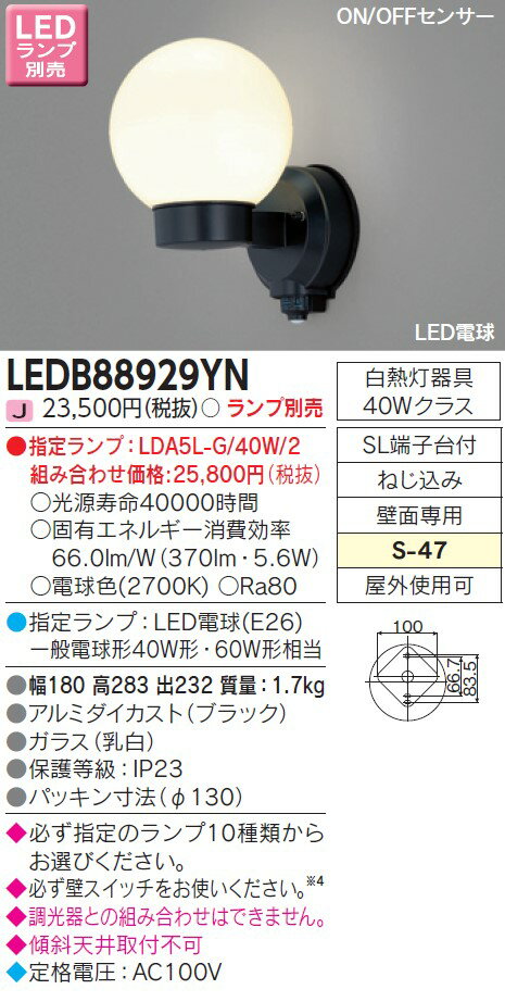 東芝 LEDアウトドアブラケット ポーチ灯 ON/OFFセンサー 壁面専用 一般電球形LED(E26)適合 黒(ブラック) ランプ別売 LEDB88929YN