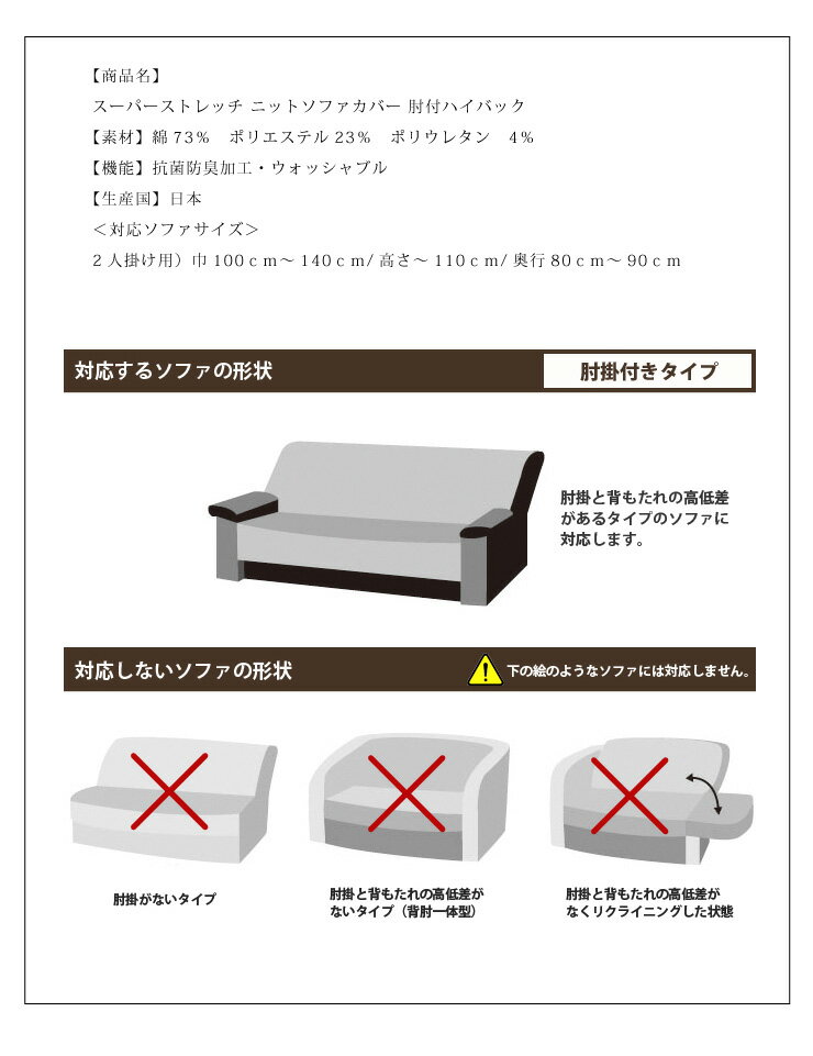 素材:綿73% ポリエステル23% ポリウレタン 4%機能:抗菌防臭加工・ウォッシャブル生産国:日本<対応ソファサイズ>2人掛け用)巾100cm〜140cm/高さ〜110cm/奥行80cm〜90cm【代引きについて】こちらの商品は、代引きでの出荷は受け付けておりません。