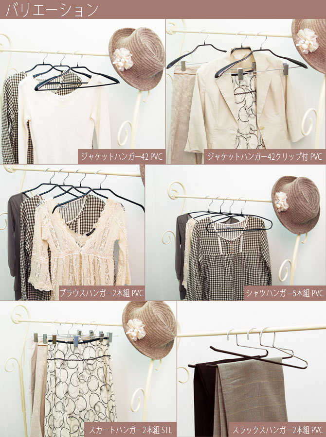 PVCハンガーシリーズ 特殊ラバー加工で、ハンガーに掛かりにくい形の衣類もすいつくように「ぴたっ」と掛ける事が出来ます。