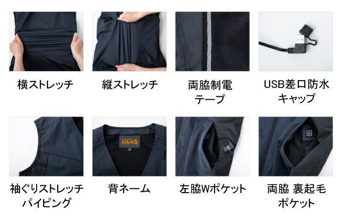 ■セット内容:ウェア(ブラック)×1、リチウムイオンバッテリー(6700mAh)×1、充電用ACアダプター用ケーブル×1■サイズ・胸囲:110cm・肩幅:46cm・着丈:69.5cm・裾まわり:108cm■ウェア素材:表地・・・複合繊維(ポリエステル)100%、裏地・・・ポリエステル100%■電池容量:6700mAh■温度目安(3段階切替):(強)約55℃/(中)約45℃/(弱) 約35℃■使用時間目安:(強)約2時間30分/(中)約6時間30分/(弱)6時間※暖G専用リチウムイオンバッテリー6700mAh使用時■充電時間:約4時間■その他機能:縦横ストレッチ、両脇制電テープ、袖口ストレッチパイピング、低温やけど防止機能、背ネーム、左脇Wポケット、両脇裏起毛ポケット、USB挿し口防水キャップ※パッケージ、デザイン等は予告なく変更される場合があります。