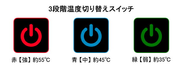(赤→強、青→中、緑→弱)●温度切替スイッチはポケット内にあるので、着たままで電源のON/OFF・温度調整をすることが出来ます。