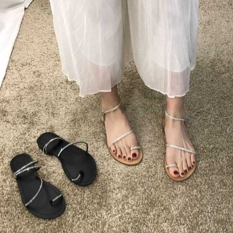 キラキラの細ストラップがアクセントになるフラットサンダル。