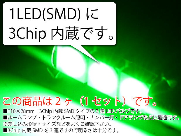3連LEDルームランプT10×28mmグリーン2個 3ChipSMD LEDルームランプ 明るいLED ルームランプ 爆光LEDルームランプ as915-2
