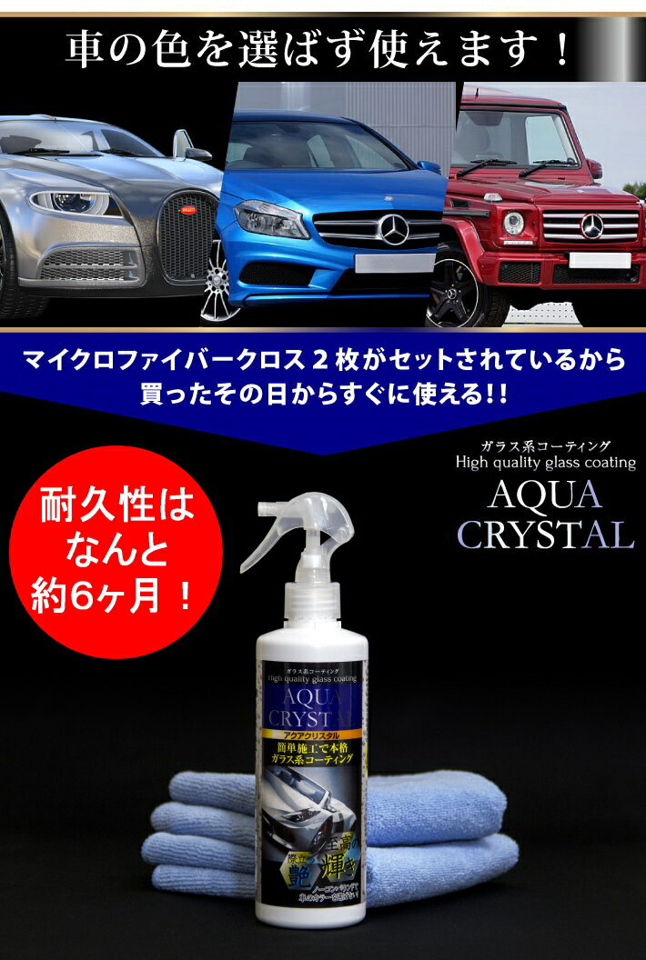 商品名 アクアクリスタル 内容量 1本/300ml セット内容 本体、トリガー、マイクロファイバークロス×2枚 成分 水、シリコーン、界面活性剤 使用上のご注意 ●用途以外には使用しないでください。