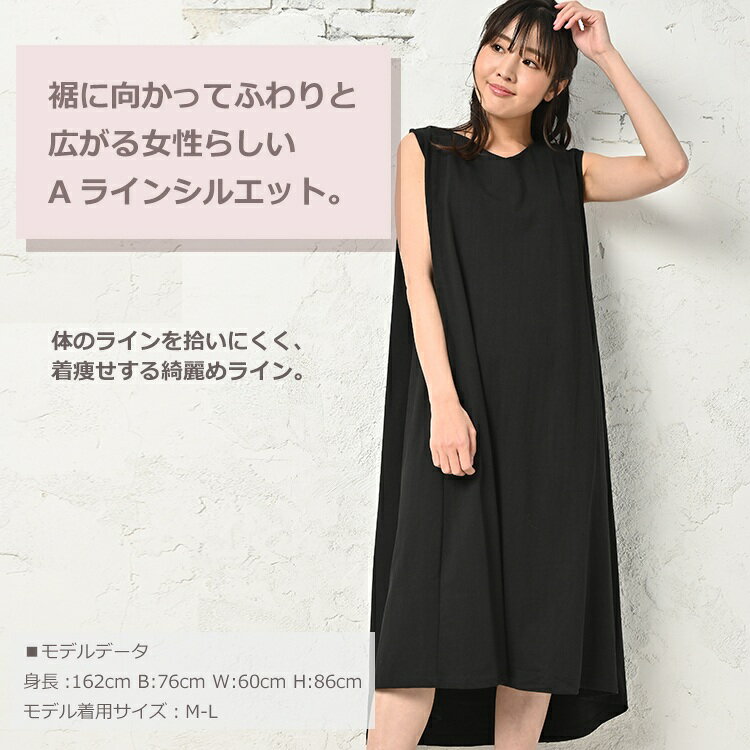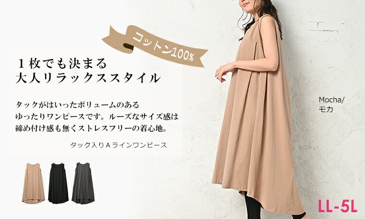 大きいサイズ レディース Aラインワンピース ロング丈 ノースリーブ Vネック タック バックテール cotton100 LL-3L/4L-5L ゆったりサイズ ぽっちゃり女子 プラスサイズ