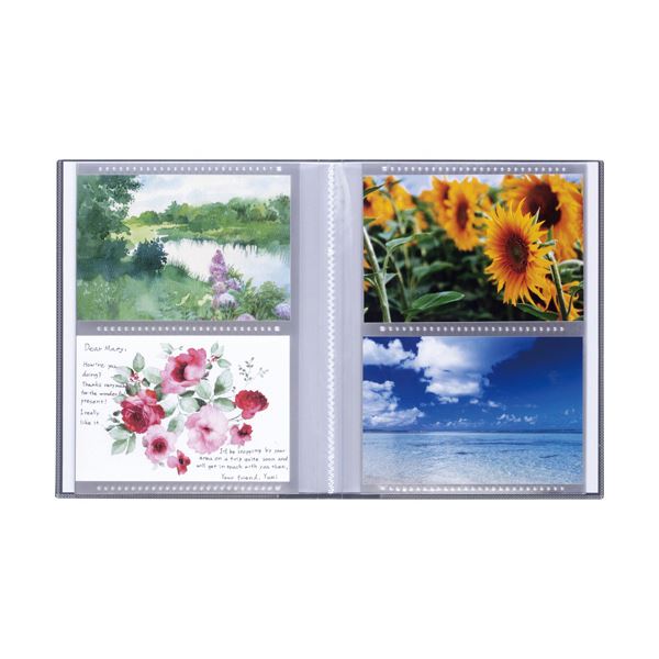 ■商品スペック色:ブラック寸法:W181×D17×H235mm収容ハガキ枚数:2段80枚(ポストカード・ハガキ・KG写真・絵手紙サイズ)材質:表紙:再生PP(0.5mm厚)、表紙ポケット:PP(0.15mm厚)、ポケット:OPP(50ミクロン)その他仕様:●溶着式ポケット●最大収容サイズ:107×155mm●表紙ポケット最大収容サイズ:228×372mm■送料・配送についての注意事項●本商品の出荷目安は【1 - 5営業日 ※土日・祝除く】となります。